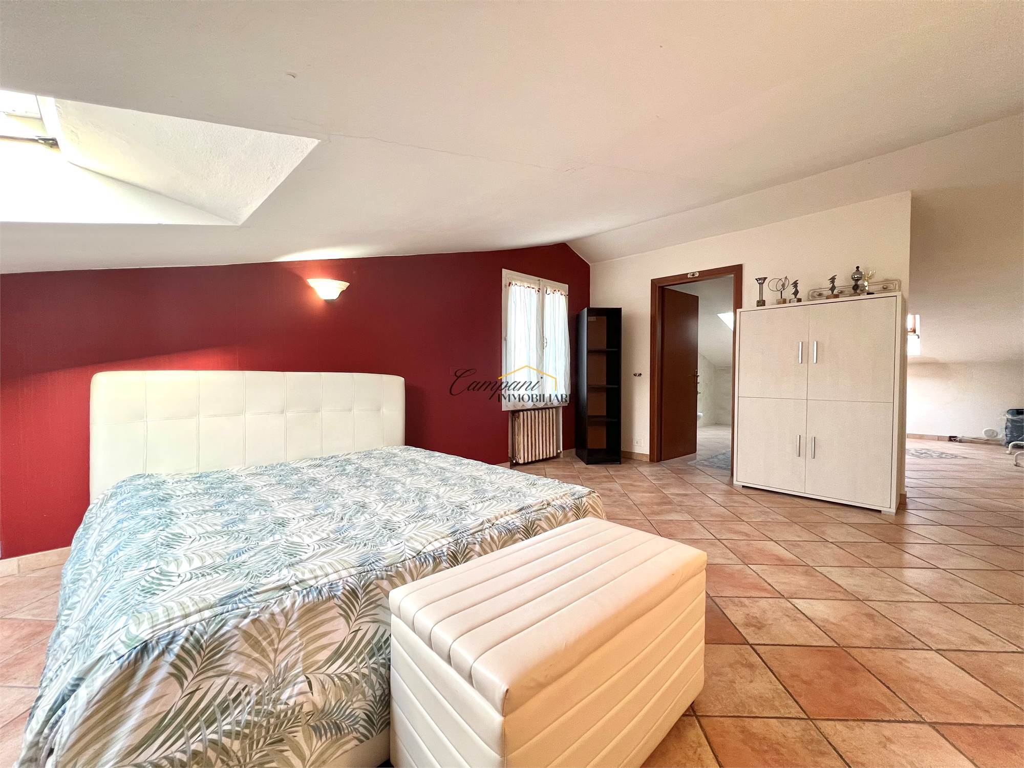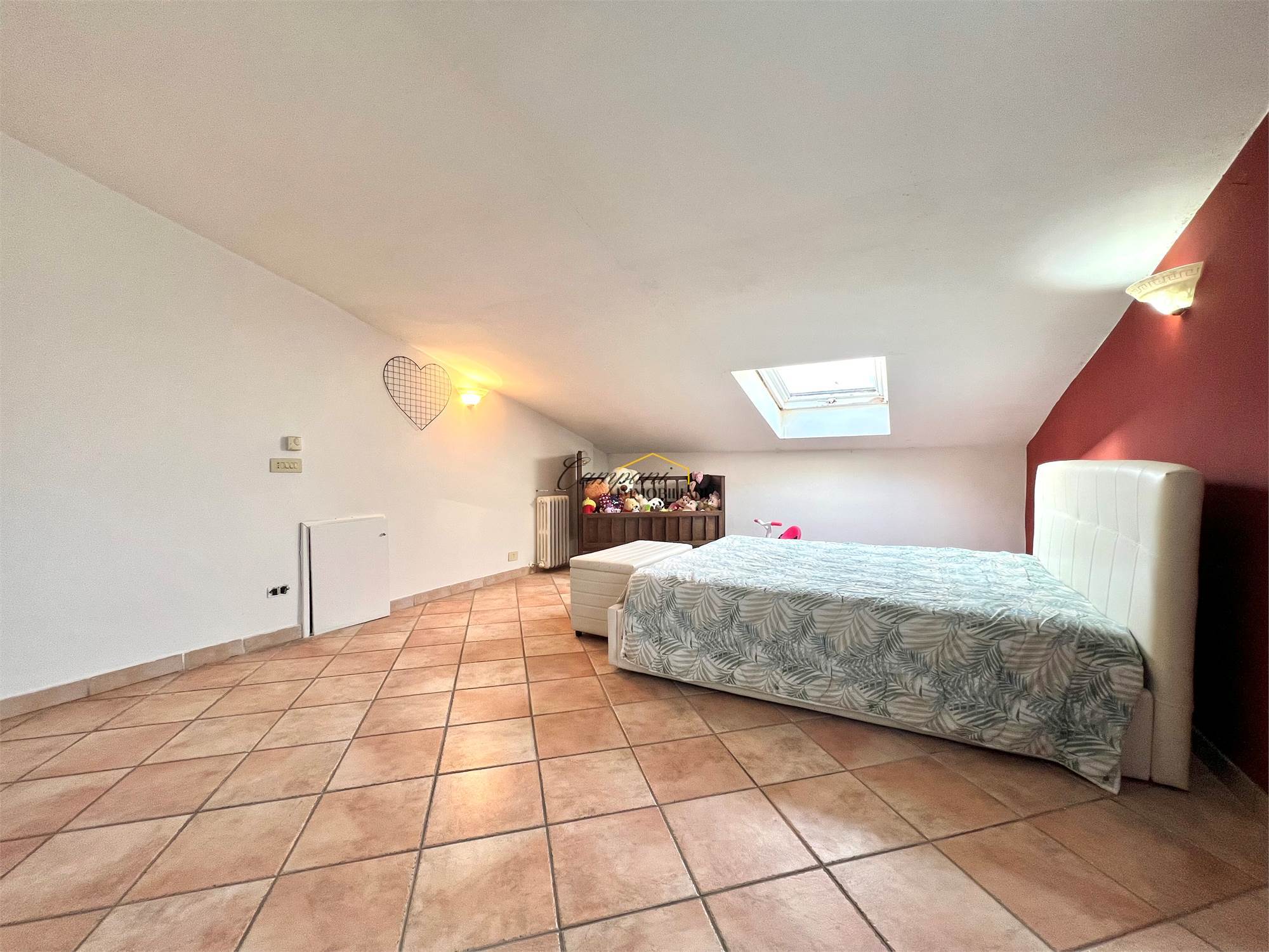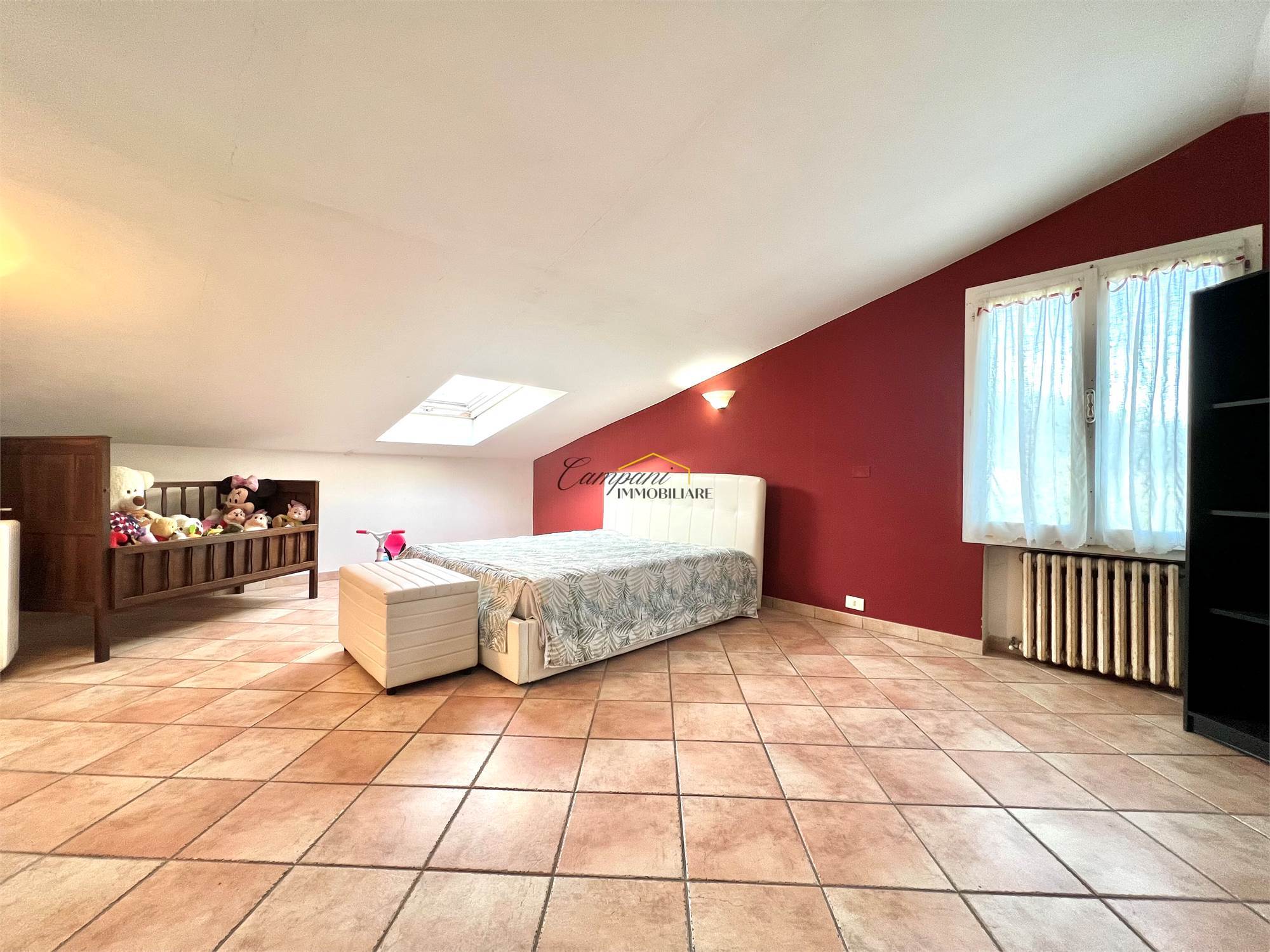 L'immobile, ristrutturato nel '97, è composto al piano terra da ingresso, ampio soggiorno, cucina abitabile e bagno/lavanderia esterno, salendo le scale al primo piano troviamo il disimpegno della zona notte, due camere matrimoniali di cui una con balcone e una con grande terrazzo e il bagno. Al secondo e ultimo piano mansardato è presente una terza camera matrimoniale, un bagno e un'ulteriore stanza con gli attacchi predisposti per una seconda cucina, ideale per creare un mini appartamento separato. All'esterno è presente il giardino di circa 150 mq, un ampio porticato e il garage.