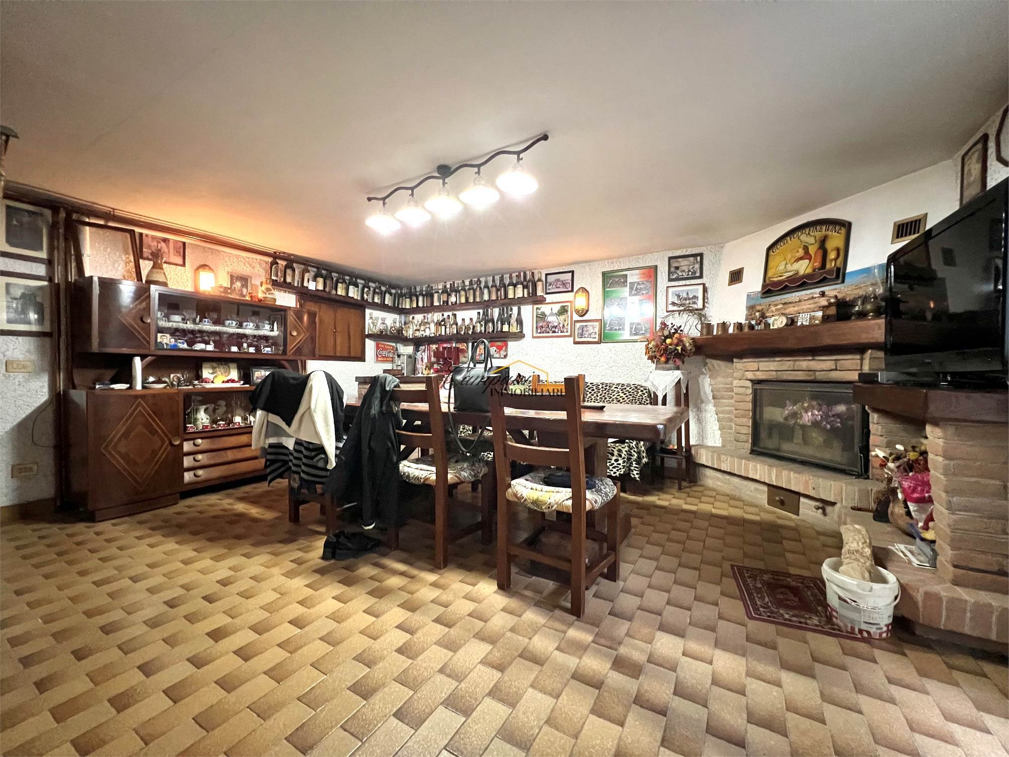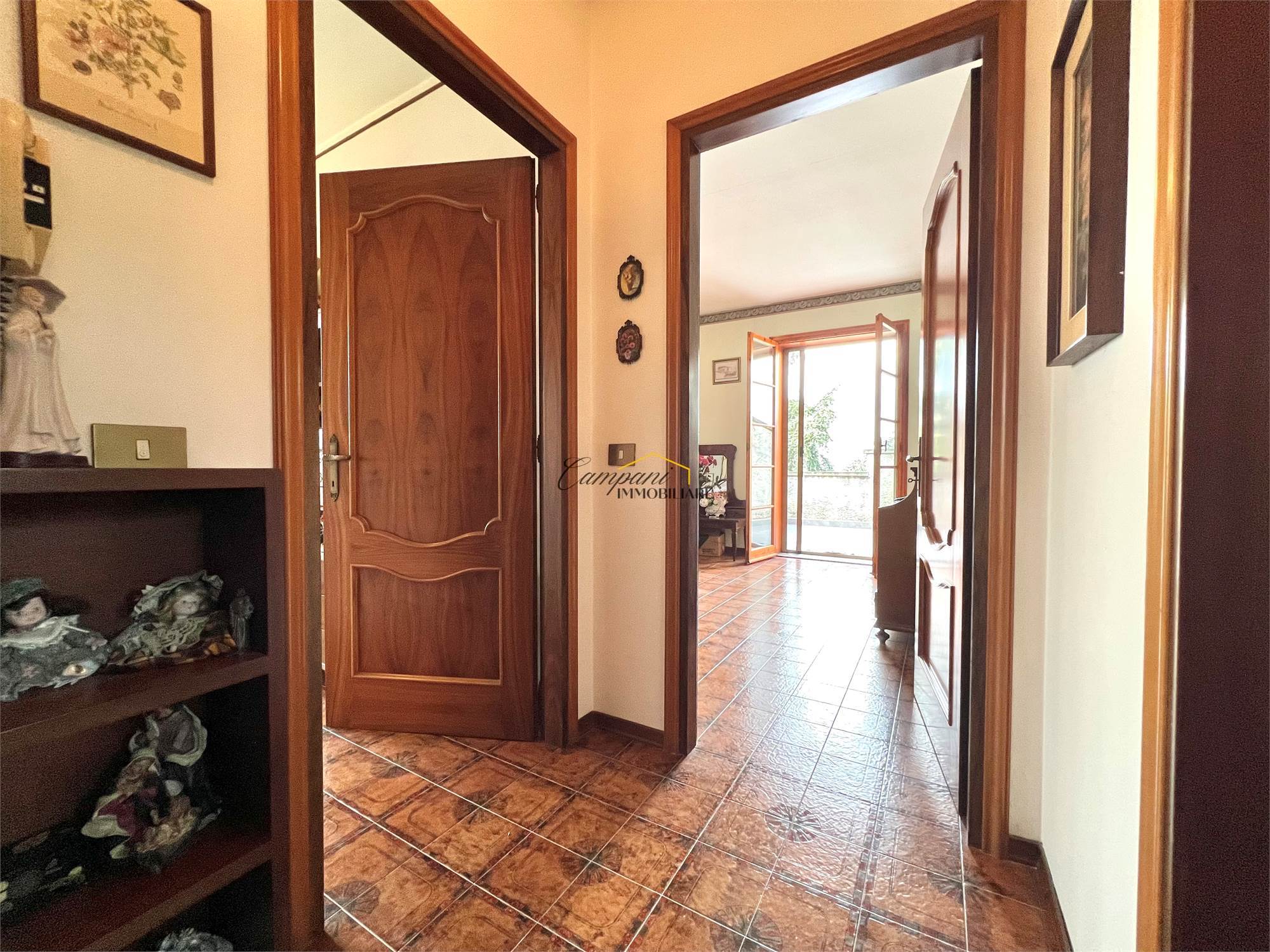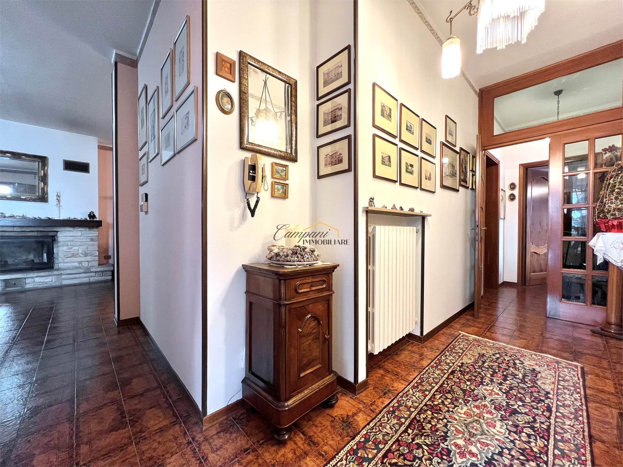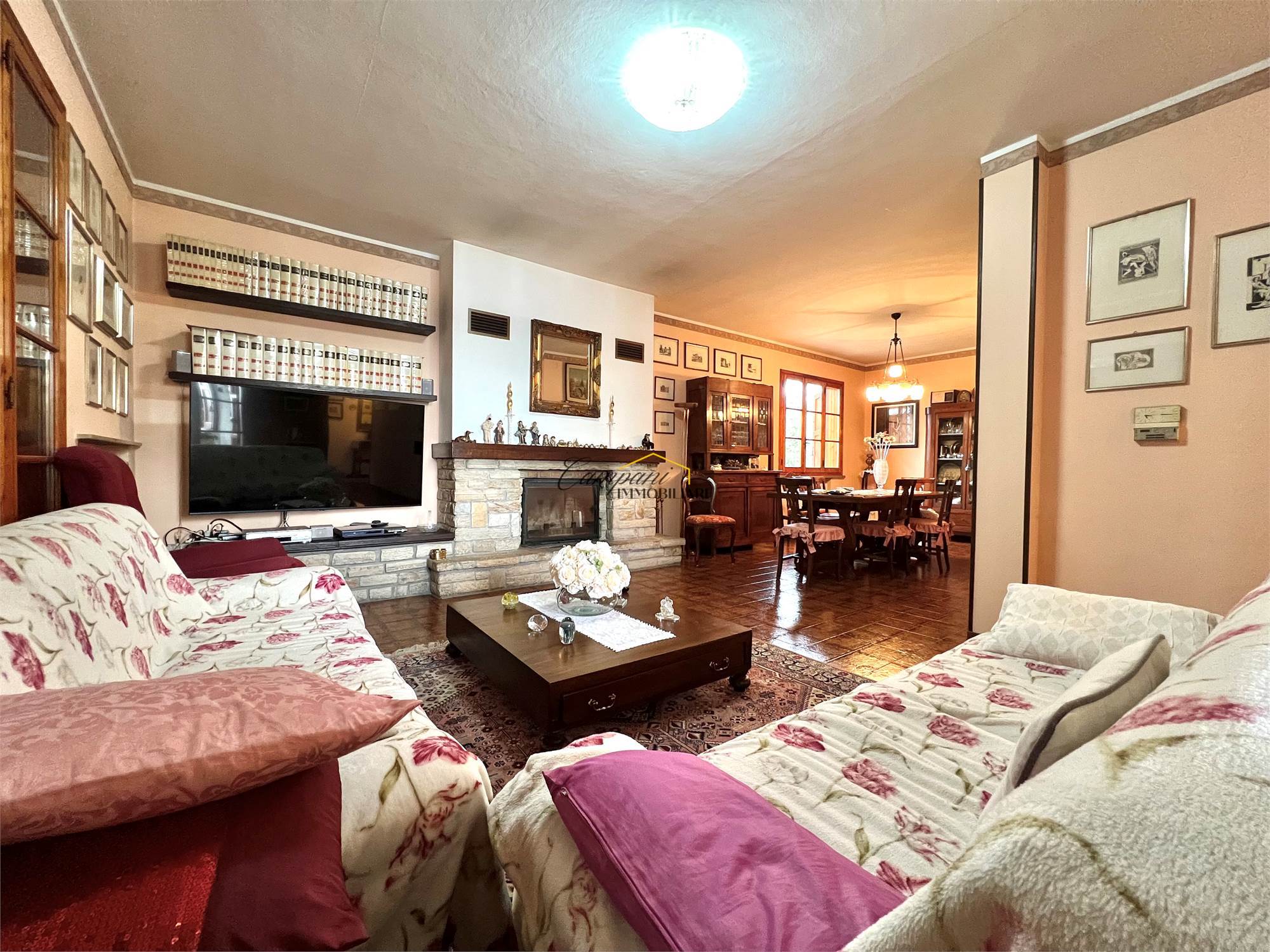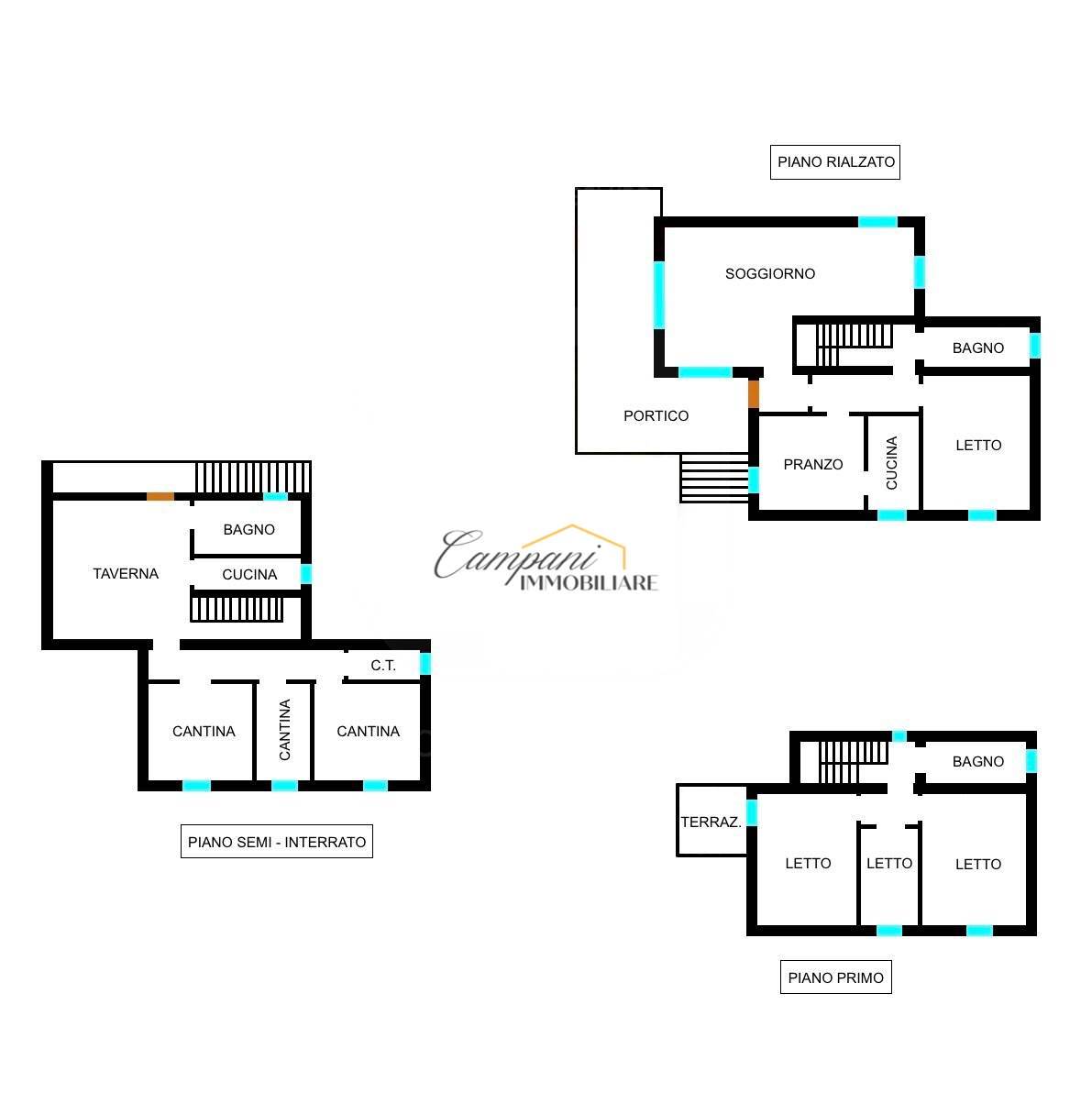 L'immobile, suddiviso in tre livelli, è composto al piano rialzato da un ampio portico di oltre 40 mq, ingresso, soggiorno doppio con camino con scambiatore di calore, sala da pranzo, cucina, disimpegno, camera da letto matrimoniale e bagno. Al primo piano troviamo il disimpegno della zona notte, due camere matrimoniali di cui una con terrazzo, una cameretta e il secondo bagno. Il piano semi - interrato si apre su una caratteristica taverna anch'essa con camino, un bagno, la cucina, tre stanze multiuso, una cantina e il locale tecnico.